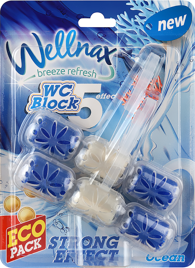 The Welnax WC Block Eco Pack with refreshing ocean scent guarantees lasting cleanliness and freshness with every flush. Easy to use, it ensures a hygienic toilet bowl and a pleasant atmosphere. Perfect for those who value reliable cleaning combined with a fresh fragrance.